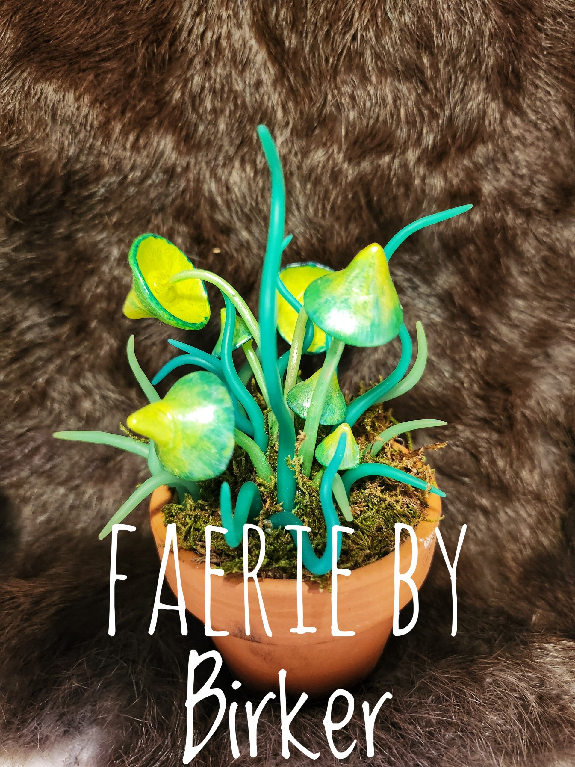 Schattige kleine paddenstoeltjes sprankelend groen als een Amazone Papegaai, in een terracottapotje. Is dat nou niet een leuke aanvulling voor in je vensterbank?