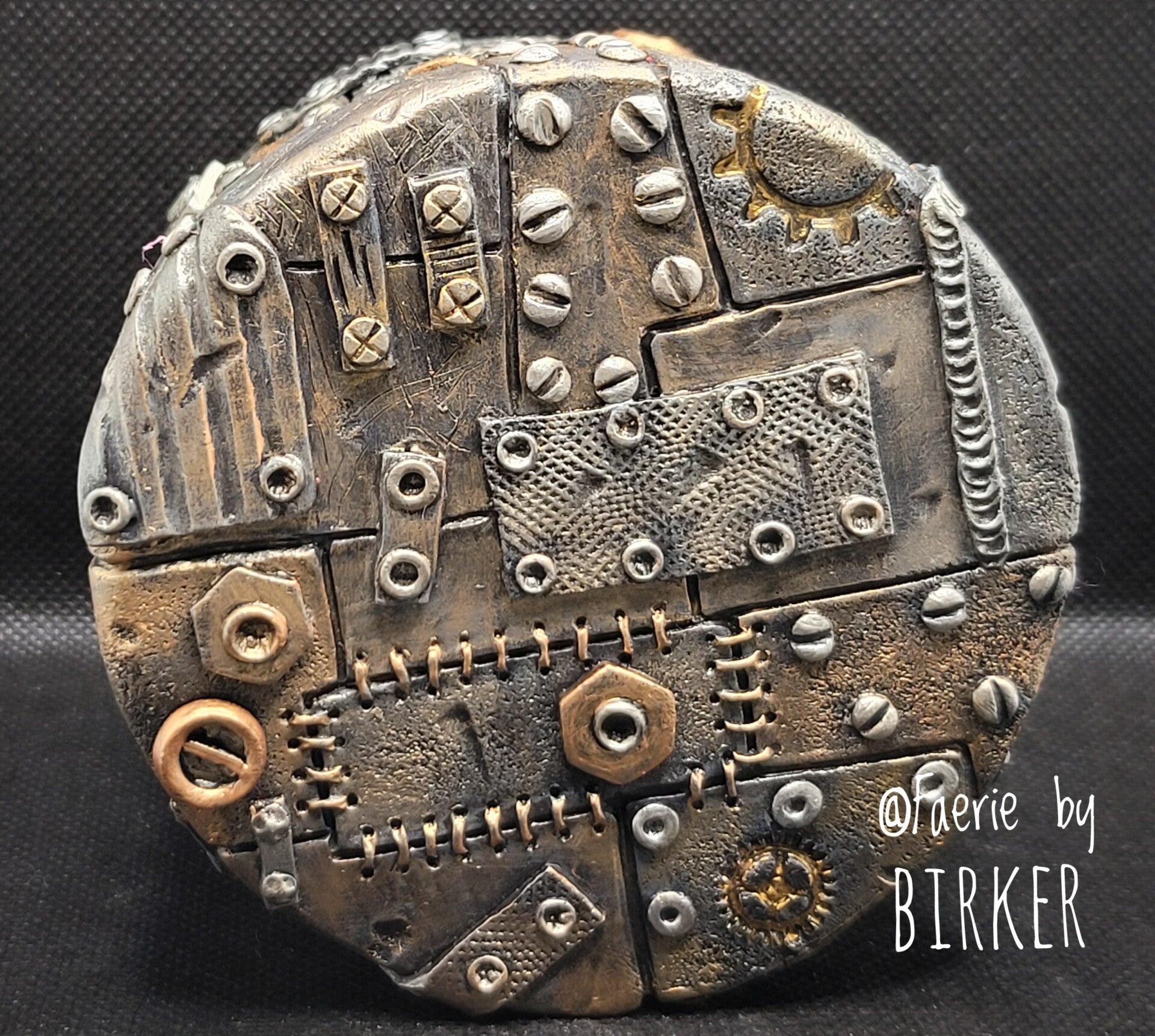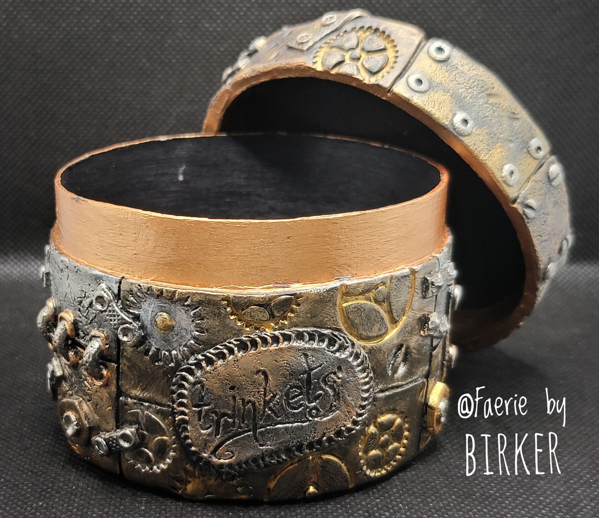 Rond doosje met deksel, opgemaakt in steampunk-stijl met veel details, gemaakt van polymeer op hout. Het geheel is handgeschilderd met artist-quality acrylverf in diverse metallic-kleuren.