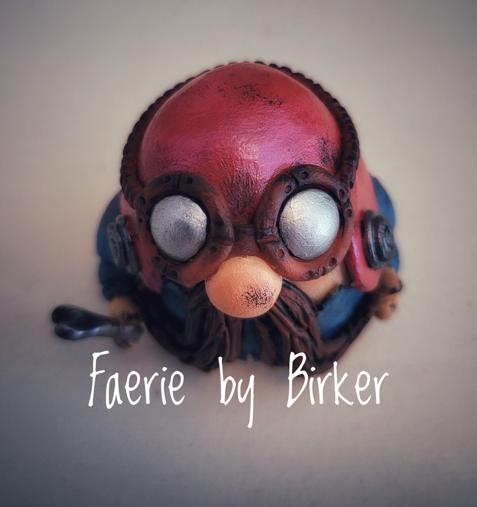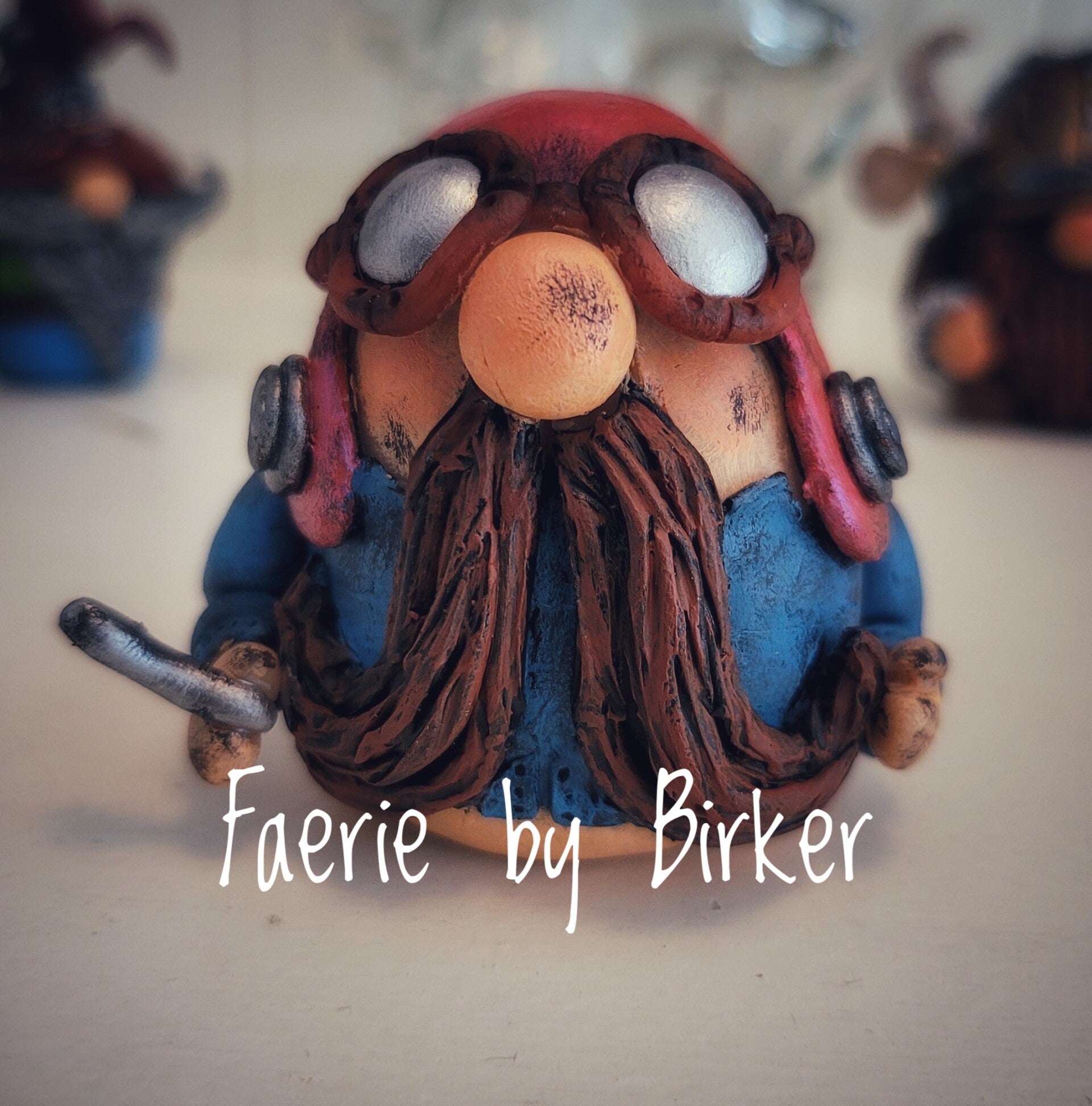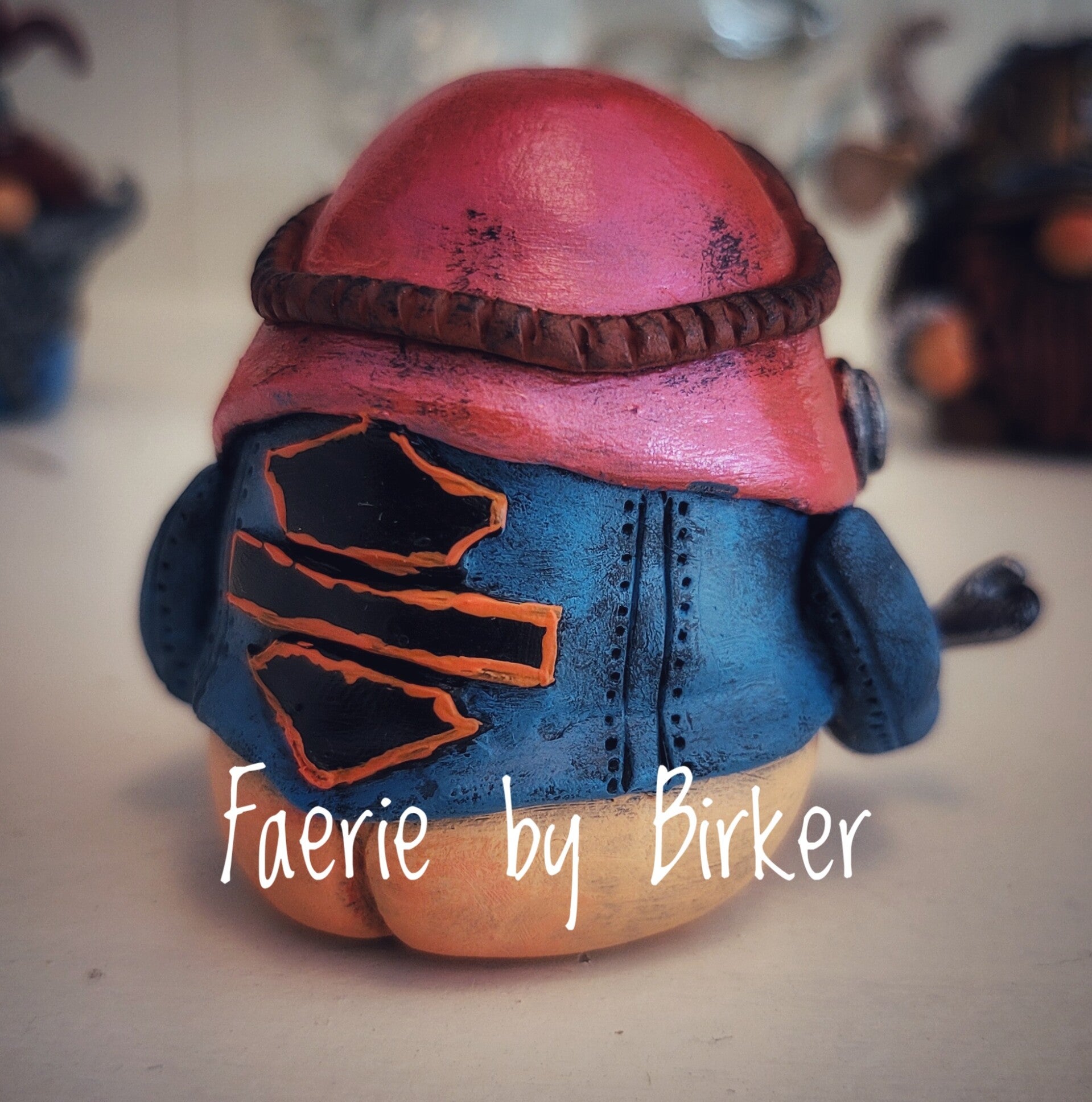 Een stoere barebutt Gnomie, Harley biker genaamd Harry. Handgemaakt van polymeer klei en handgeschilderd met artist-quality acrylverf.