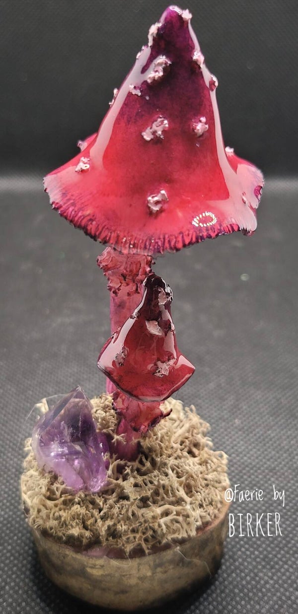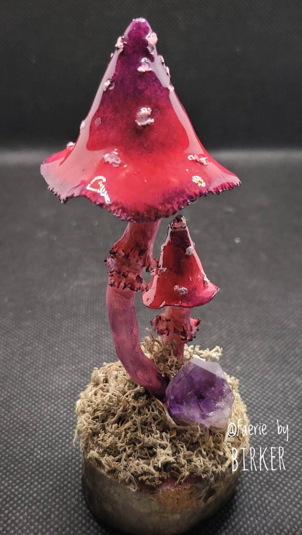 Geweldige fantasie paddenstoeltjes, gemaakt van polymeer klei en handgeschilderd met artist-quality acrylverf in rose/paars tinten. Voor het 'natte' effect zijn de hoedjes voorzien van een UV-resin. Samen met een mooie amethist en natuurlijk mos is het geheel gemonteerd op een stukje boomstam.